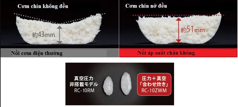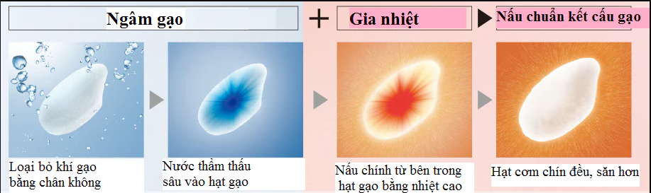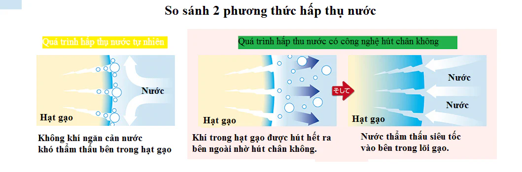 Quá trình loại bỏ không khí giúp nước thẩm thấu tận sâu bên trong lõi hạt gạo nhờ công nghệ chân không, giúp quá trình nấu cơm được rút ngắn thời gian nấu cơm đáng kể.