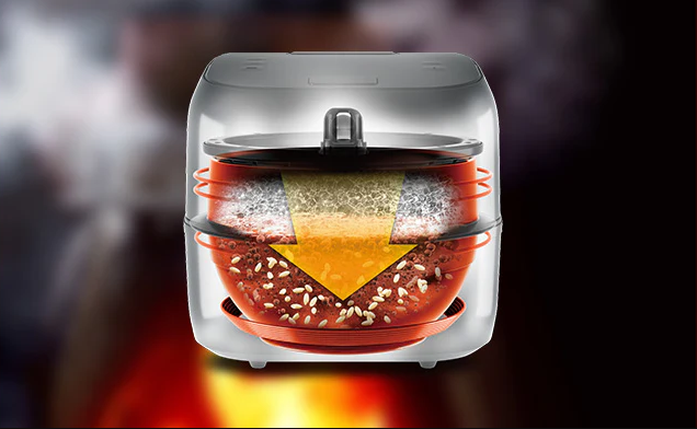 Trong quá trình nấu cơm, toàn bộ không khí trong nồi được hút đẩy ra ngoài tạo môi trường chân không và chênh lệch áp suất giúp từng lõi gạo được hấp thụ nước tối đa. Nhiệt được truyền từng hạt gạo thúc đẩy quá trình chuyển hóa tinh bột beta β cứng thành tinh bột alpha α. Quá trình chuyển hóa này giúp cải thiện độ ngọt và độ mềm dẻo của gạo sau khi nấu rất tốt cho hệ tiêu hóa.